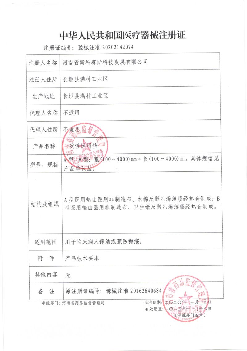 河南省斯科賽斯科技發(fā)展有限公司創(chuàng)建于 2011 年,位于“中國醫(yī)療耗材之都”- 河南省長垣縣,西臨 308 省道,南靠新菏鐵路,北依長濟(jì)高速,交通便捷,經(jīng)濟(jì)發(fā)達(dá),環(huán)境優(yōu)美。斯科賽斯積極進(jìn)入醫(yī)療健康和服務(wù)領(lǐng)域,秉承為用戶創(chuàng)造價(jià)值的理念,專注于醫(yī)用耗材解決方案的研發(fā)和運(yùn)營,并為用戶提供完善的產(chǎn)品解決方案;  斯科賽斯主要生產(chǎn)醫(yī)用麻醉系列、醫(yī)用高分子系列、醫(yī)用敷料包系列、醫(yī)用無紡布系列、醫(yī)用防護(hù)系列、醫(yī)用脫脂棉系列、生物材料制品類等七大類、100 多個(gè)品種、400 多個(gè)規(guī)格的產(chǎn)品。公司占地面積約 30000 平方米,建筑面積20000 平方米,擁有 10 萬級的凈化車間總面積 10000 平方米。擁有國際先進(jìn)水平的生產(chǎn)設(shè)備和檢測儀器,技術(shù)裝備精良,檢測手段完善,為醫(yī)療行業(yè)的不斷發(fā)展進(jìn)步提供保障。公司順利通過 ISO9001、ISO13485 質(zhì)量管理體系認(rèn)證?! ∷箍瀑愃箞?jiān)持研發(fā)高科技新產(chǎn)品,力爭在醫(yī)療器械關(guān)鍵領(lǐng)域取得技術(shù)和研發(fā)的重大突破;立足國內(nèi)和國際兩個(gè)市場,逐步實(shí)現(xiàn)管理理念、經(jīng)營機(jī)制、人力資源、技術(shù)、產(chǎn)品、市場等全方位對接,提高企業(yè)的核心競爭力;過去的歲月里,斯科賽斯砥礪前行,誠信務(wù)實(shí),銳意進(jìn)取,不斷創(chuàng)新,用自己的睿智和辛勞,以富有責(zé)任感的使命,在探索中追求,在追求中超越,致力于成為值得信賴的醫(yī)療用品生產(chǎn)企業(yè)!在未來的日子里,斯科賽斯將一如既往豪情滿懷,信心百倍,攜手并肩,執(zhí)著追求,向更高的的目標(biāo)前進(jìn),鑄造新的輝煌!
